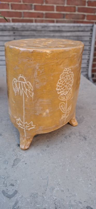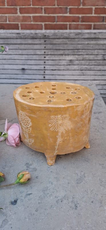 Goudkleurige flowerbrick op pootjes met ingekraste bloemen.